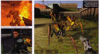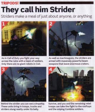 Investigating means using the torch that, oddly, is linked to a minor criticism of the game. Both sprinting and flashlight use are linked to a recharging energy bank. It's clear why this restriction was imposed, but it's nevertheless a little peculiar. The quality of the game meant that I was searching, rather desperately, for similar complaints. Smugly I assumed that my allies in a battle were non-human because that way Valve dodged the lack of realism and other problems created by fighting alongside human allies. Of course my lack of faith was exposed a few levels later, when I found myself in the midst of the war-torn city fighting alongside numerous human allies who patched me up, shouted at me to reload, apologised when they got in the way and fought valiantly against a vastly superior force. What a battle that was. I want to go back, right now. The striders, so impressive to behold, are the most fearsome of foes. Fighting both these behemoths and a constant flow of Combine troops creates what is without a doubt the most intense and exhilarating conflict ever undertaken in a videogame. The laser-pointer rocket launcher is back and even more satisfying than ever before. Rocket-crates give you a seemingly infinite resupply to battle these monsters but it's never straightforward. Striders will seek you out, forcing you under cover, while the whale-like flying gunships will shoot down your rockets, inducing you to resort to imaginative manoeuvring to perform that killing blow. Even dying becomes a pleasure—you want to see these beasts smash through walls and butcher the rebels, again and again. Oh Christ, what will happen next?
