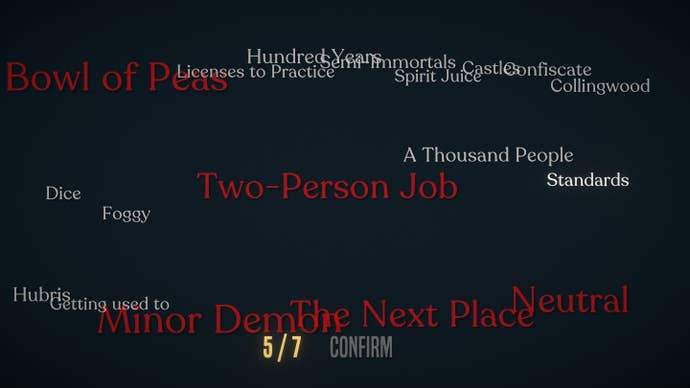 I unfortunately stumbled a bit with this system. Over the course of conversations in the episodic sections, a word or phrase is occasionally highlighted in yellow. Click on it, and there's a short glossary-like explanation, usually offering further context about whatever was said. These words show up at the end of each episode, floating around in a sort of word cloud. Then, it has you pick just seven of them.