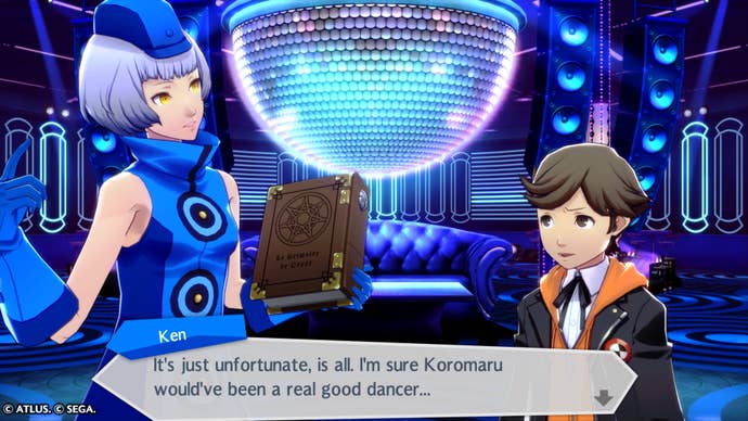 The Social event scenes, which contain a handful of dialogue options and either one or two characters facing you, usually revolve around the loose set-up as to why you're all there: you're in a dream, preparing for a ball in the series-constant Velvet Room. Because of this, when you meet up with your pals, you're practicing dancing and talking about dancing at some capacity. With this being a non-canon spin-off, allegedly when everyone wakes up, no one will remember anything.