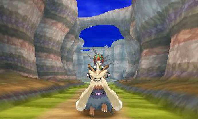 Not every creature here speaks to me quite like an owl wearing a bow tie and laughing privately to itself, but every single critter you fight and/or capture here demonstrates a similar level of attention paid to its presentation and personality. I mean, there's only so much you can do to create player affection for a certain pesky pokémon that dogs you with constant random encounters every time you step into a cave (because Game Freak evidently believes that this annoying design element is part of Pokémon's inextricable charm), but nevertheless each and every creature in the bestiary has its own distinct battle animations and animations for the "pokémon care" mode wherein you can groom, pet, and feed your beloved captives to increase their sense of happiness and enhance their performance in combat.