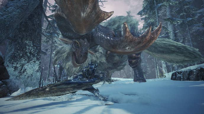 As Iceborne is technically endgame content—you have to finish the main game and achieve Hunter Rank 16 to access the expansion—it largely dispenses with tutorials and almost immediately throws you against your first new monster. That would be the Beotodus, a shark-like creature that moves swiftly beneath the snow, occasionally leaping out from the drifts to deal damage and sap your stamina with Iceblight. (You'll be dealing with Iceblight a lot in Iceborne.) Having long since tired of MHW's original menagerie, it was bracing to have a new challenge, and while I dispatched it with relative ease on my first attempt, it very much got me back into the swing of hunting.