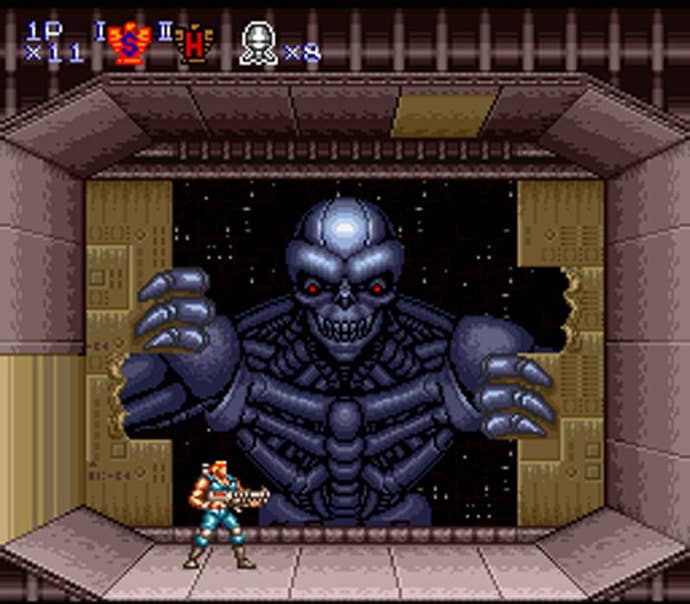 It's probably a good thing I'm not awarding points for story, though: Contra III's overarching narrative is slim pickings. Aliens are ripping up planet Earth, and Konami's meatiest heroes immediately take up arms to stop them. In North America, the heroes are named "Jimbo" and "Sully." In Japan, they're Bill and Lance. You can call them Big McLargeHuge and Crunch ButtSteak for all the difference it makes. The important thing is that both are very talented with an assortment of guns.