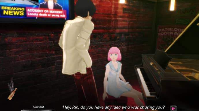 The story's choice-based progression evolves in the same way as the original: in the decisions you make while hanging out at the Stray Sheep bar. There you talk to its customers and learn about their own issues, catch up with your friends, drink, play the in-game puzzle arcade cabinet Rapunzel, and even talk to Rin, who Erica and the Boss of the bar have taken in as an employee. Vincent texts Katherine, Catherine, and Rin during these segments, swapping photos and choosing text messages very carefully. The Stray Sheep has a nifty jukebox too, where you can play a number of tracks from Catherine, Persona 5, Persona 4, and more's respective soundtracks. (You bet your ass I had Persona 3's "Burn My Dread" playing on loop.)